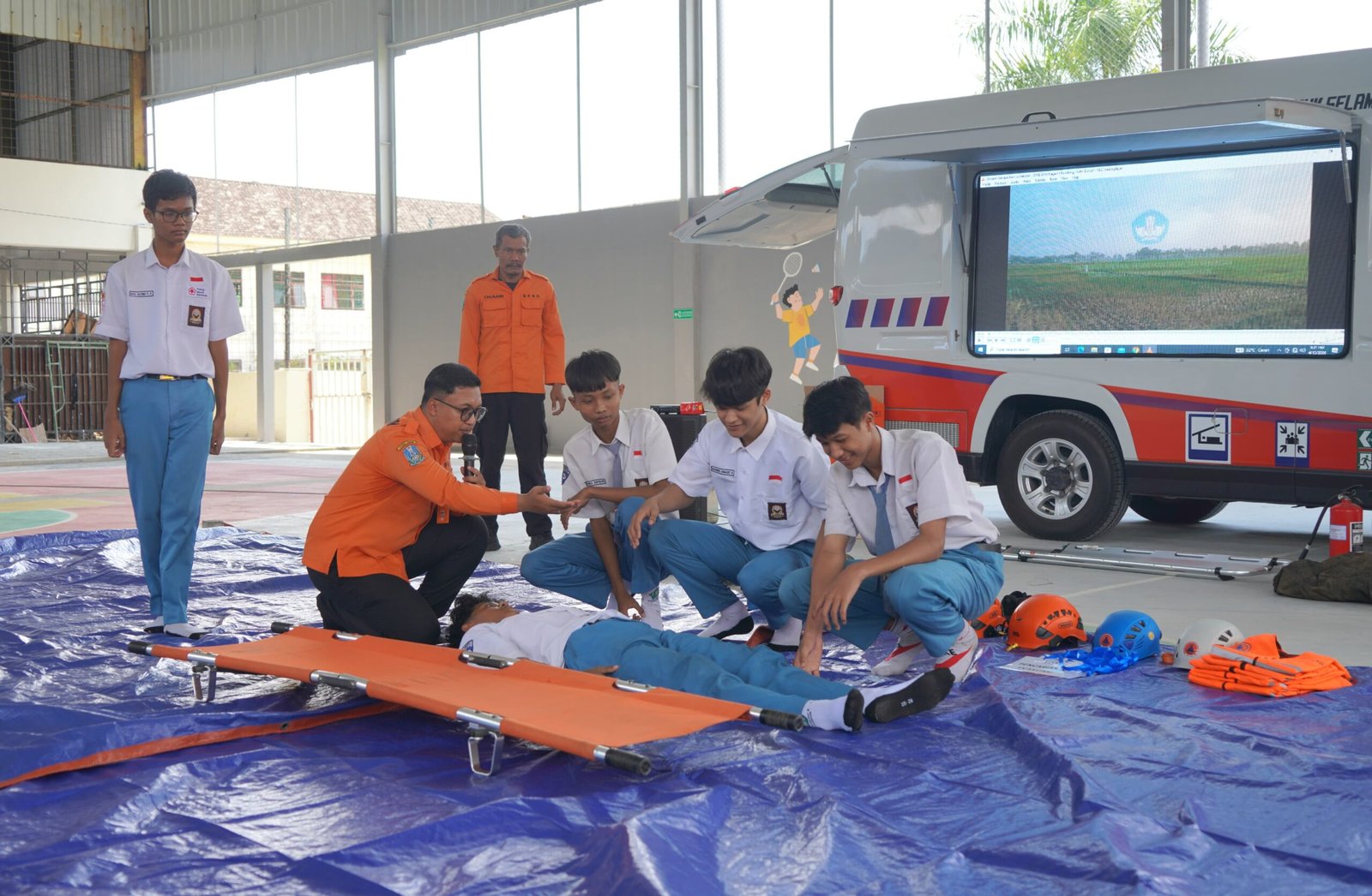 Suasana di lapangan terasa sangat hidup. Para siswa dan santri tidak hanya duduk mendengarkan, tetapi terlibat langsung dalam simulasi evakuasi mandiri saat menghadapi gempa bumi. Tak hanya itu, mereka juga diajarkan cara memadamkan api (kebakaran) dengan prosedur yang benar. Antusiasme terpancar jelas saat Tim Mosipena membongkar perlengkapan edukasi mereka yang interaktif.