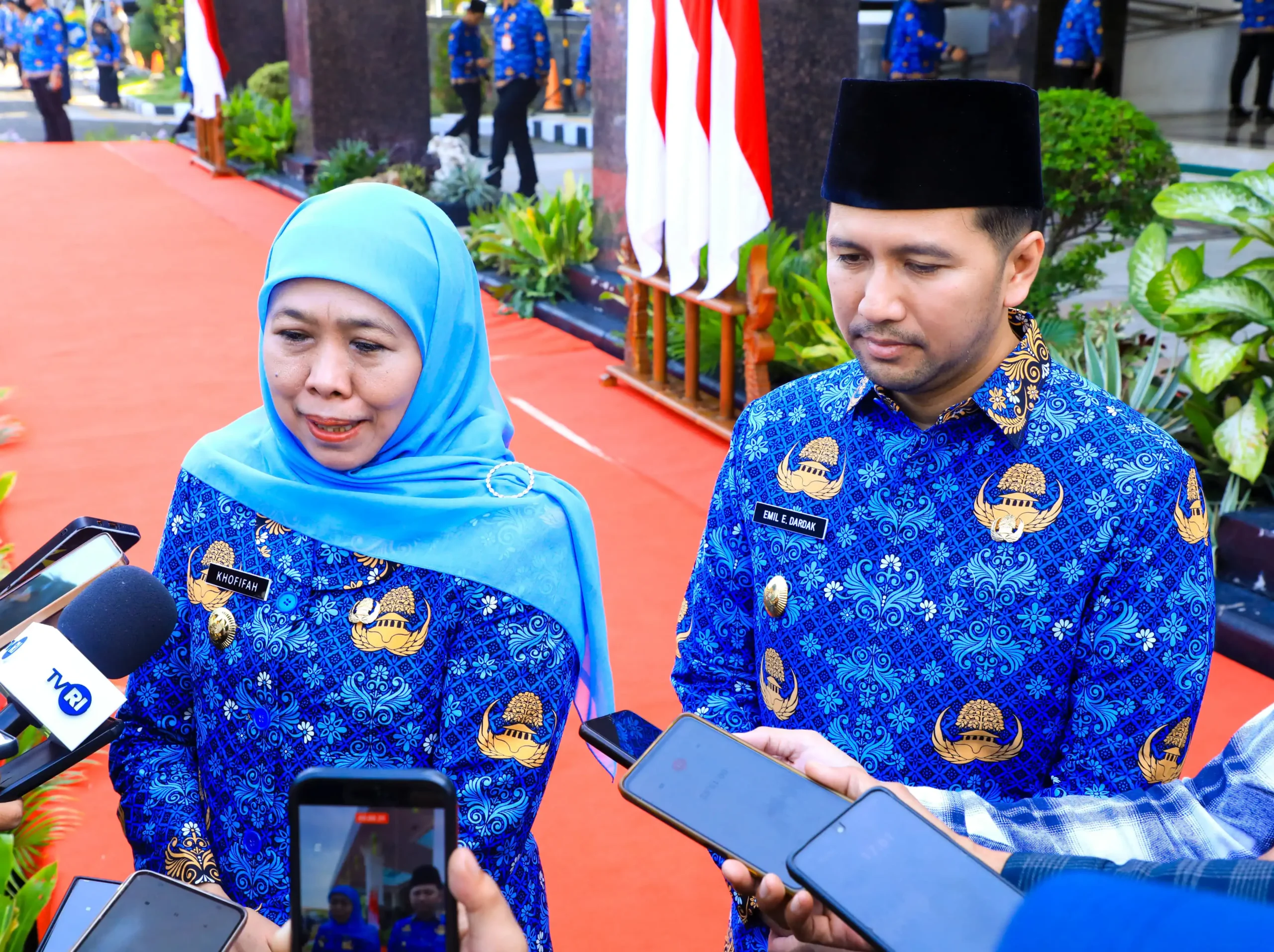 Gubernur Khofifah didampingi Wagub Emil saat diwawancara awak media